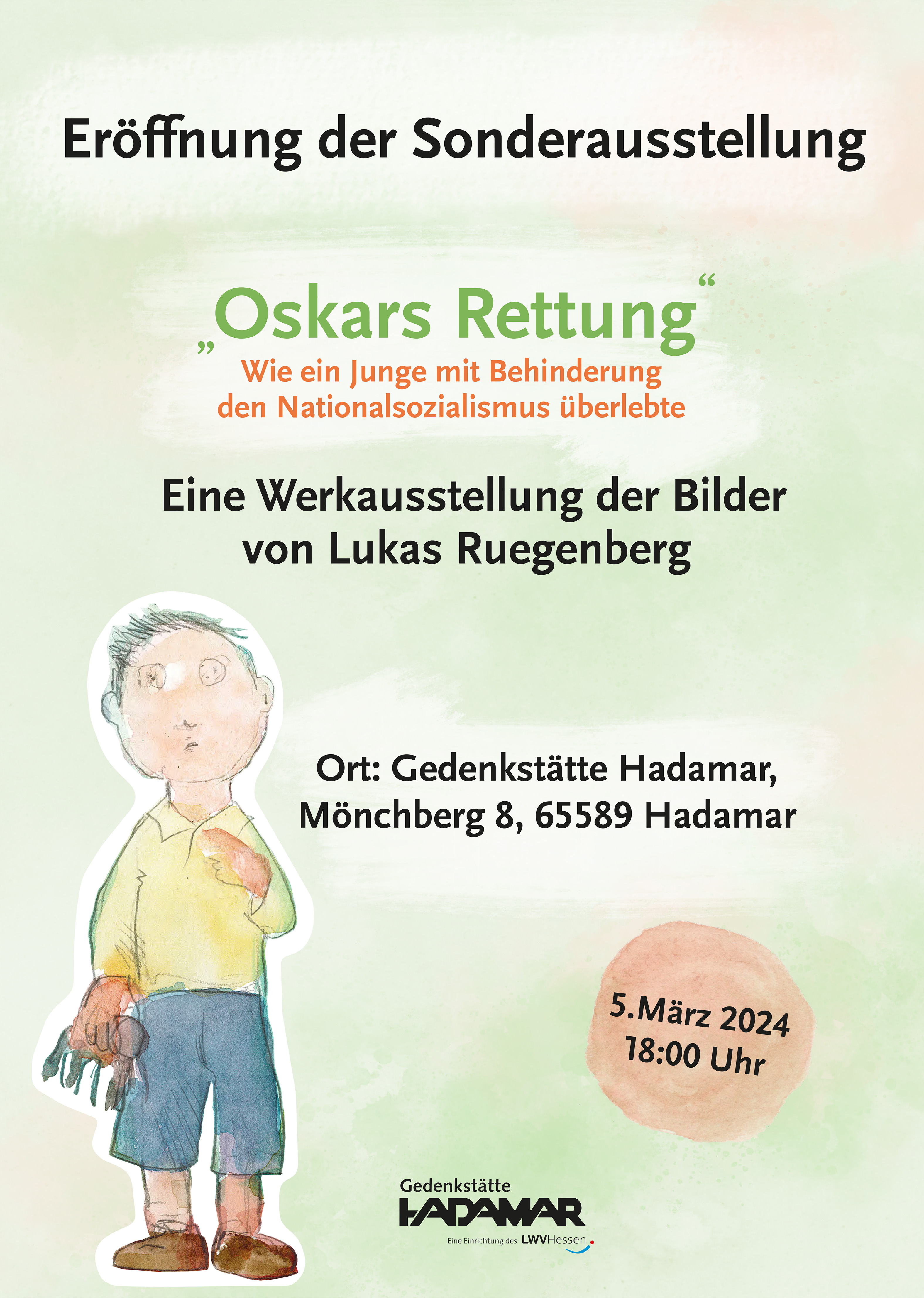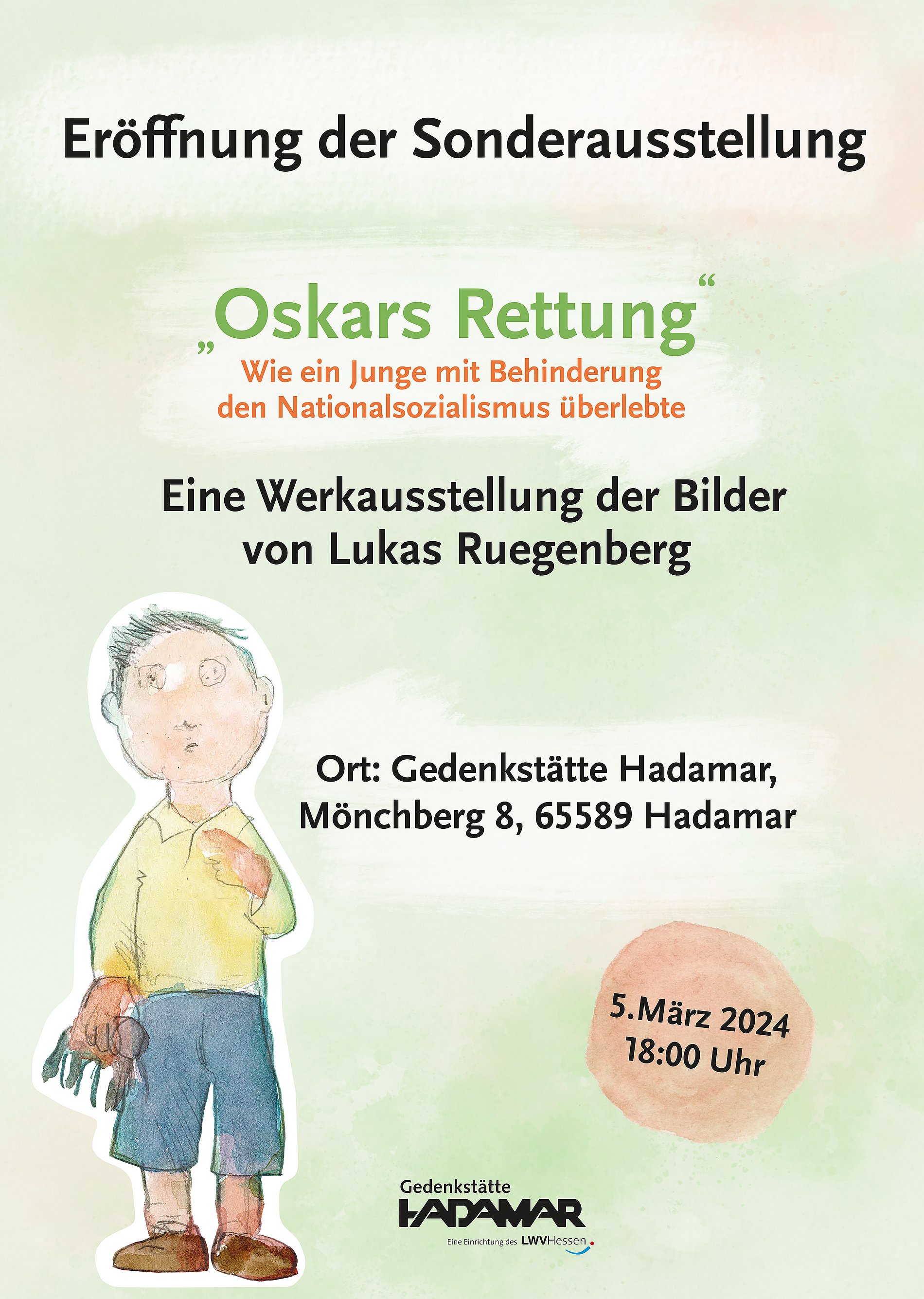 „Oskars Rettung – Eine Werkausstellung der Bilder von Lukas Ruegenberg“. Eröffnung der Sonderausstellung in der Gedenkstätte Hadamar am 5. März 2024. Die Hintergrundgeschichte: Oskar wird 1932 in Münster geboren. Nach einem Unfall ist er verändert. Er stottert und sein rechter Arm ist teilweise gelähmt. Kinder wie er passen nicht in das Weltbild der Nationalsozialisten, sie gelten als „minderwertig“. Das bekommt Oskar von seiner Umwelt deutlich zu spüren. Irgendwann kann nur noch das Verstecken Oskars Leben retten. Oskars Überlebensgeschichte ist nun als Bilderbuch mit Aquarellen von Lukas Ruegenberg erschienen. Mehr Infos auf der Seite des Bistums Limburg.