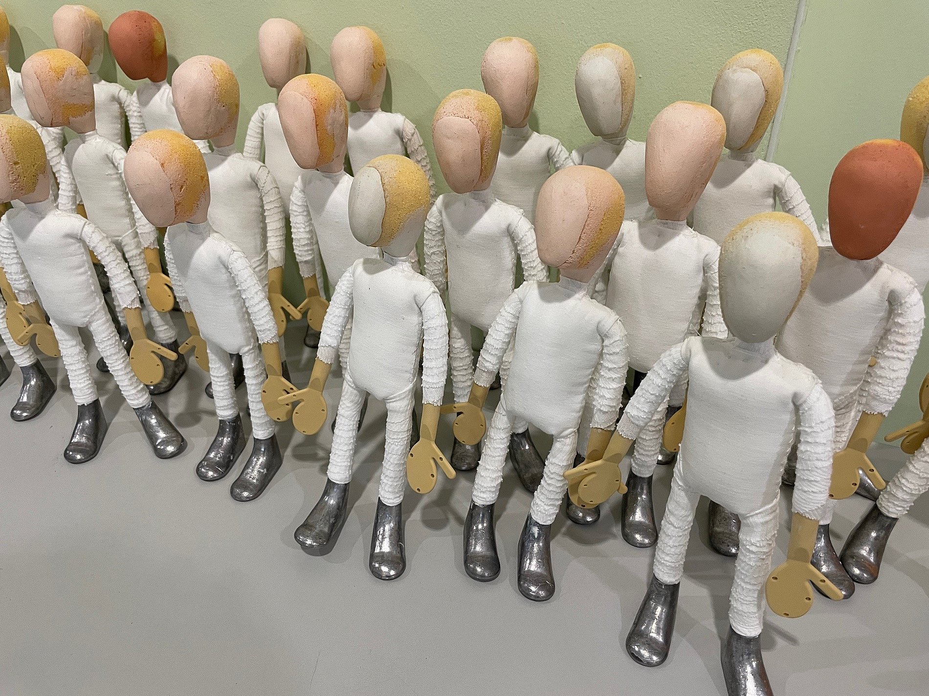 Sie hatte bereits große Vorarbeit geleistet und brachte uns eine Vielzahl an vorbereiteten Rohlingen mit. Deren Köpfe waren bereits modeliert und die Grundform des Körpers war schon um das Sisalgestell gearbeitet. In einem extra Raum waren unzählige Kleider und Umhänge ausgebreitet; Perücken füllten Kiste um Kiste. Und doch blieb für die neun Teilnehmerinnen noch genug zu tun. Schon das Überziehen der Rohlinge mit dem hautähnlichen Stoff sorgte für die ersten Schweißperlen auf den Stirnen und das Vernähen des Stoffs für einen Anstieg des Pflasterverbrauchs.